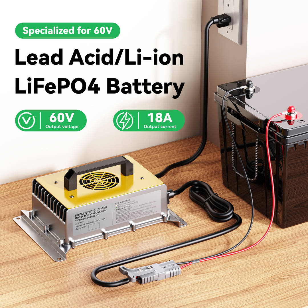 Specifically, when the charger charges a 57.6V lithium battery, and reaches the constant voltage stage of 57.6V and the current reaches 2A, the charger cut off automatically; When the charger charges a 57.6V lead-acid battery and reaches the constant voltage stage of 57.6V and the current reaches 5A, the charger switches to the float charge stage of 55.2V. If use the charger which designed for lithium batteries to charge lead acid batteries , this way will reduce the life of lead acid batteries due to the lack of floating charging 55.2v; If use the charger which designed for lead acid batteries to charge lithium batteries , this way will cause the lithium battery to not be fully charged due to the process of floating charging 55.2v. Therefore, we recommend that lead-acid batteries and lithium batteries be charged by their specially designed chargers respectively.