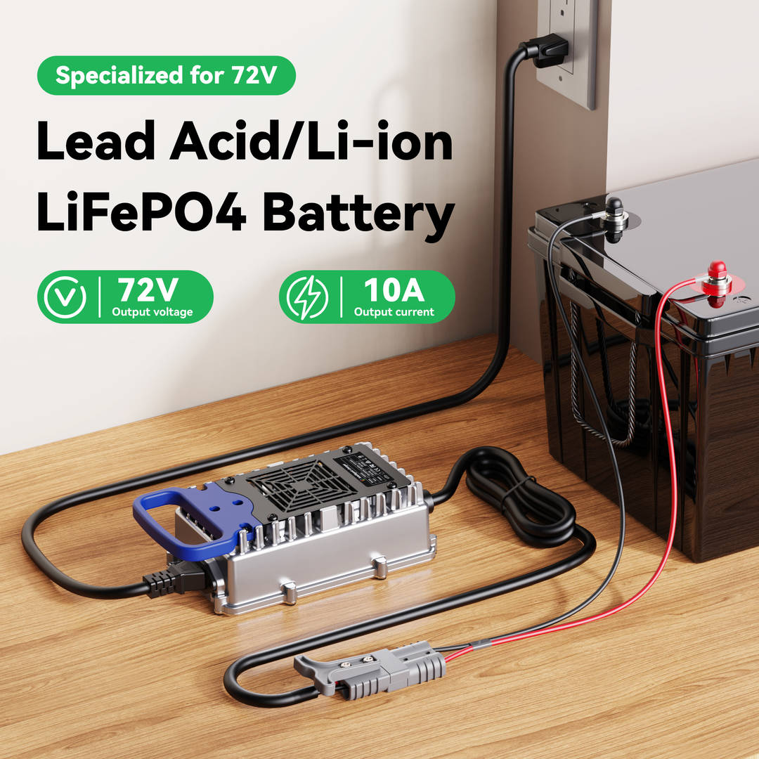 Specifically, when the charger charges a 57.6V lithium battery, and reaches the constant voltage stage of 57.6V and the current reaches 2A, the charger cut off automatically; When the charger charges a 57.6V lead-acid battery and reaches the constant voltage stage of 57.6V and the current reaches 5A, the charger switches to the float charge stage of 55.2V. If use the charger which designed for lithium batteries to charge lead acid batteries , this way will reduce the life of lead acid batteries due to the lack of floating charging 55.2v; If use the charger which designed for lead acid batteries to charge lithium batteries , this way will cause the lithium battery to not be fully charged due to the process of floating charging 55.2v. Therefore, we recommend that lead-acid batteries and lithium batteries be charged by their specially designed chargers respectively.