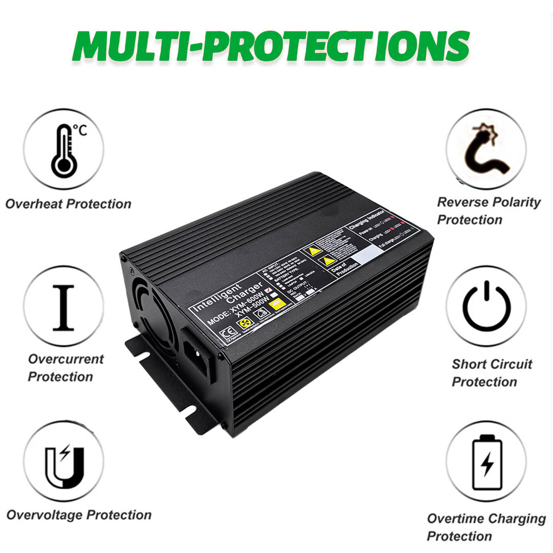 This charger is designed with multiple safety features, such as overcharge protection, short circuit protection, reverse polarity protection, etc., to prevent any damage to the battery pack or the charger itself. The charger is also designed to automatically detect the battery pack charge level and adjust the charging rate accordingly to ensure safe and efficient charging every time.